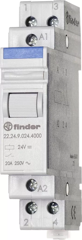 Műszaki adatok: Csatlakozó (építőelem): Csavaros kapocs · Kapcsolási teljesítmény (max.): 1000 W · Max. kapcsolási áram: 20 A · Megszólalási feszültség (max.): 24 V/DC · Méret, szélesség: 58.4 mm · További műszaki adatok: Szerelési módszer: DIN sín