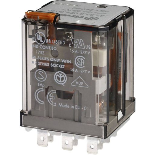 Tápcsatlakozó relé 3 váltóérintkező 16 A / 250 V AC-hoz Faston 187-tel (4,8 x 0,5 mm), kézi tesztgomb és mechanikus kijelző, érintkező anyaga AgSnO2, tekercsadatok 230 V AC, 3 VA, 7250 Ohm, relévédelem típus: RT I