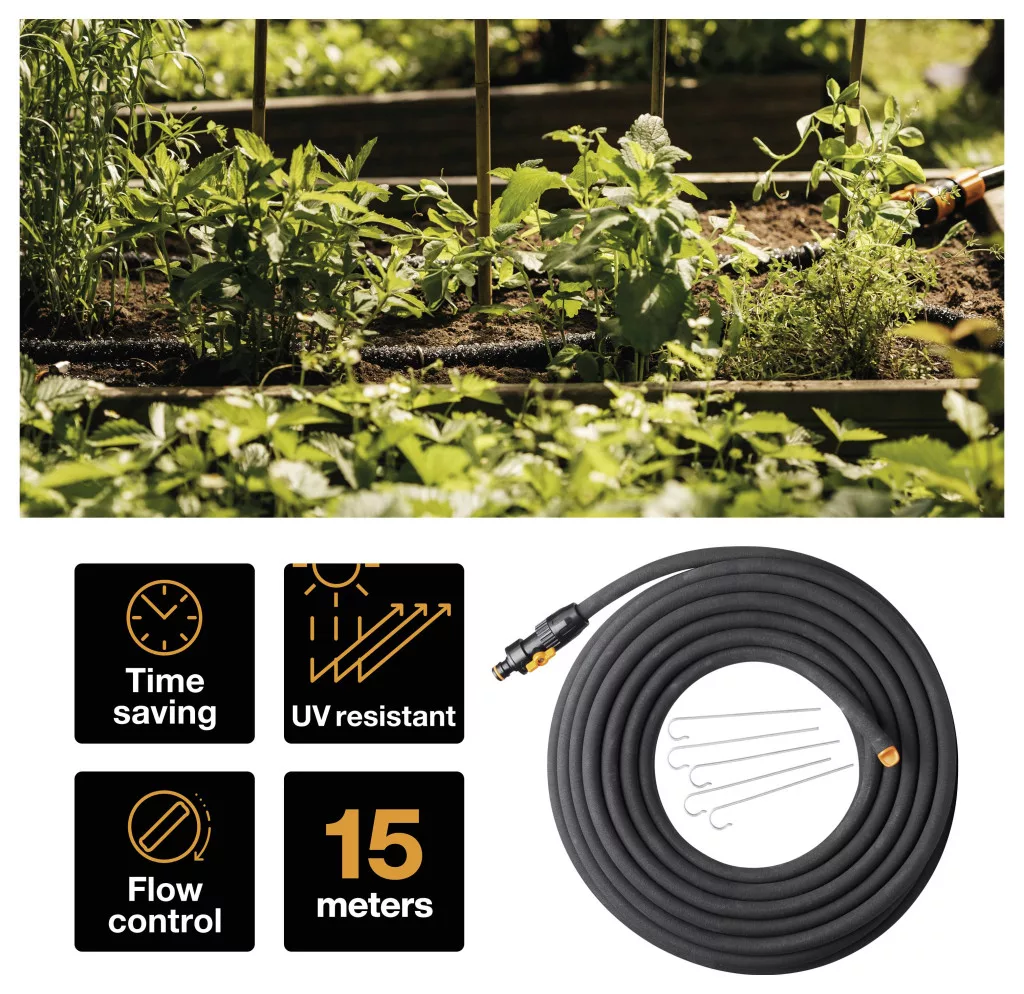 A Fiskars csepegtetőtömlő ideális eszköz új ültetésekhez, cserjékhez és magaságyásokhoz, mivel közvetlenül a gyökerekhez juttatja a vizet, miközben a leveleket szárazon tartja. Ezenkívül ez a közvetlen öntözési módszer akár 70%-kal is csökkenti a vízfogyasztást.