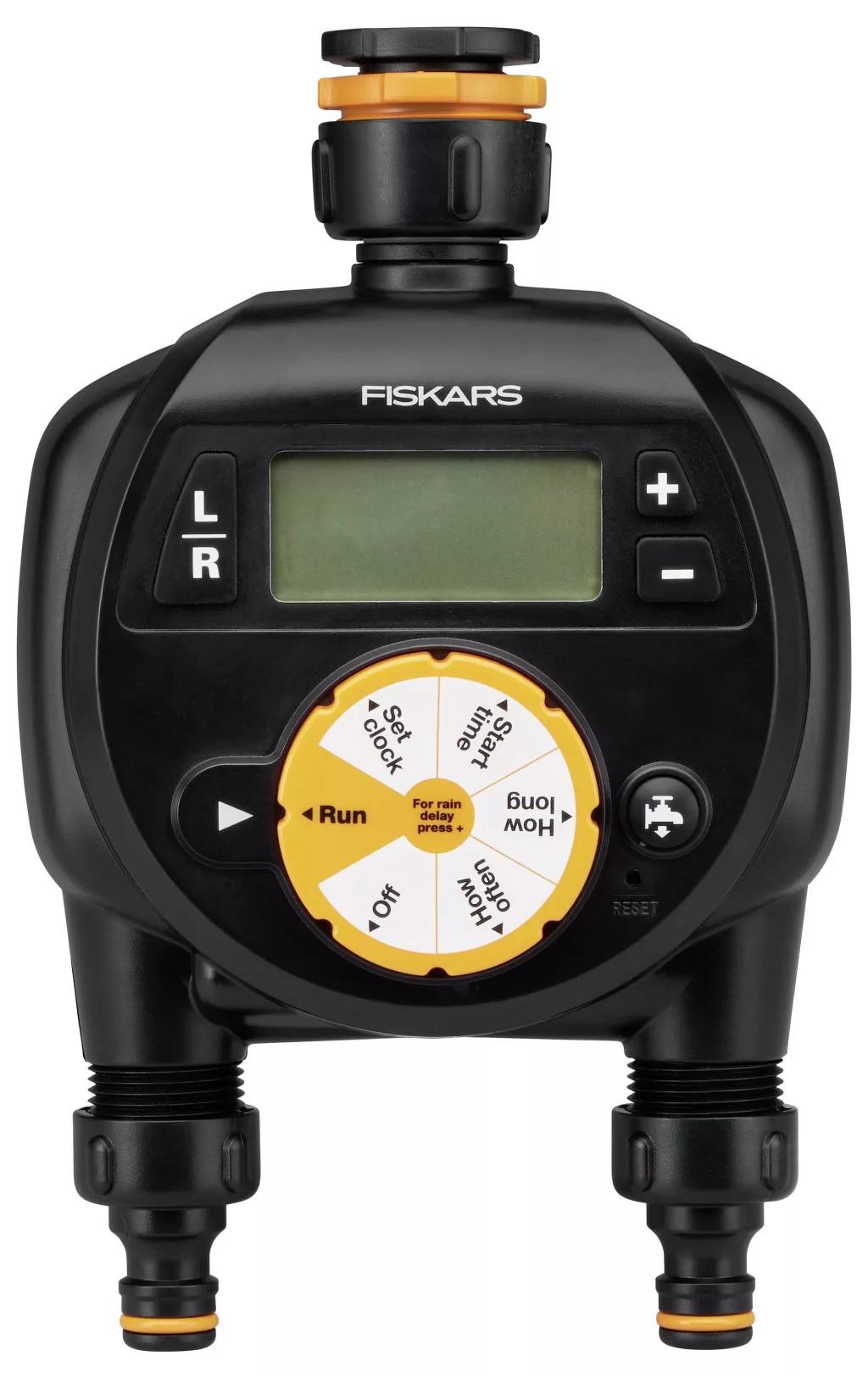 A Fiskars öntözőórái a tökéletes idő- és víztakarékos eszközök a gyep és a kert számára. Könnyen beállítható és használható, ez az időzítő automatikusan be- és kikapcsolja a vizet az Ön ütemtervének megfelelően. Két kiöntőegység fele annyi idő alatt öntöz, és ugyanazon ütemterv szerint vagy függetlenül is működhetnek. Ezenkívül azonnali öntözési gombbal is rendelkeznek, amellyel a csapot a beállítások megszakítása nélkül lehet megnyitni, alacsony akkumulátortöltés elleni védelemmel, valamint univerzális, hárommenetes csapcsatlakozóval, amely a legtöbb csapmérethez illeszkedik.