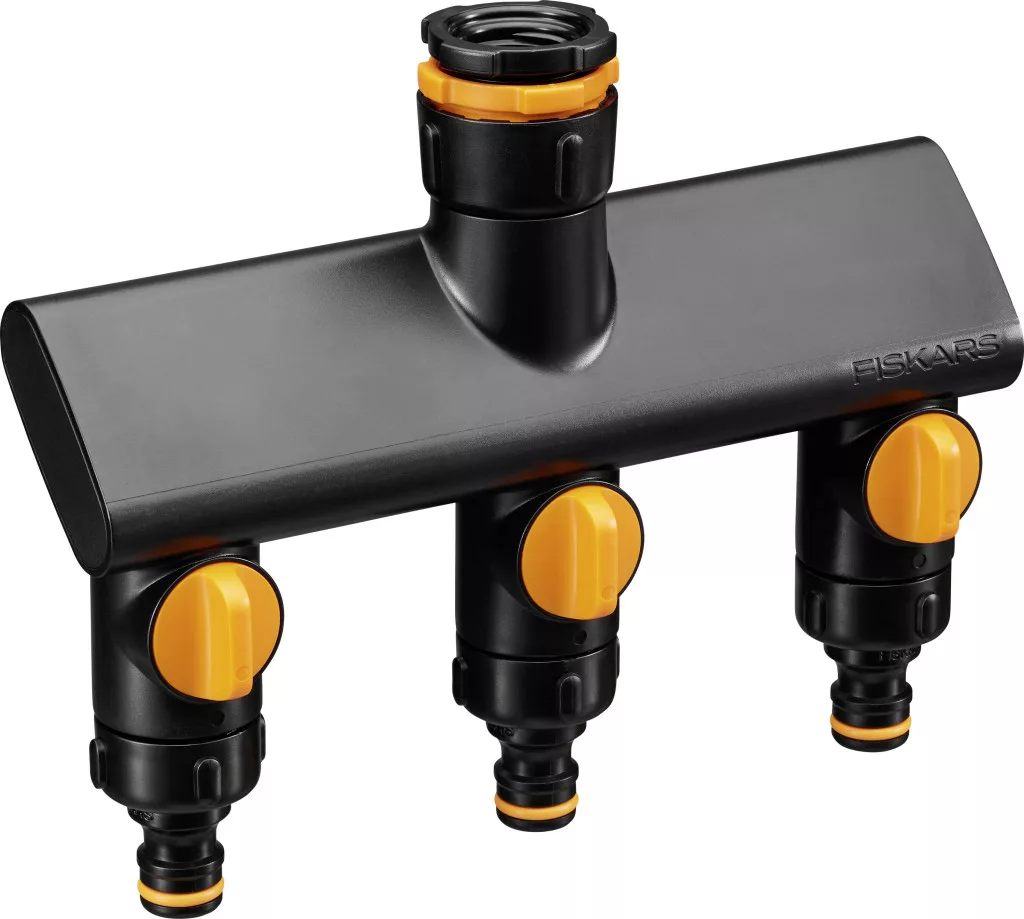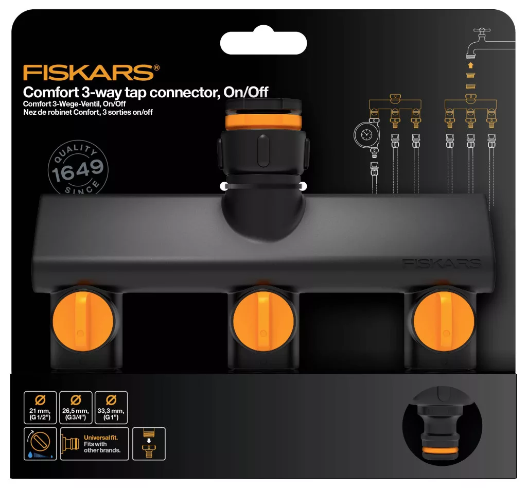 A Fiskars Comfort 3-utas szelep, ki/bekapcsoló, lehetővé teszi három különálló tömlő egyetlen vízforráshoz való csatlakoztatását. A független be-/kikapcsoló szelepek könnyen használhatók, és lehetővé teszik az egyes tömlőkhöz áramló vízmennyiség külön-külön történő szabályozását. Ez a csapcsatlakozó a három leggyakoribb csapmérethez rendelkezik menettel: Ø 21 mm (G 1/2" ), Ø 26,5 mm (G 3/4" ) és Ø 33,3 mm (G 1" ). A gyorscsatlakozó végei szükség esetén 3/4" -os csatlakozásokhoz is eltávolíthatók, például időzítők használatához. Univerzális csatlakozó más öntözőberendezésekkel, beleértve más márkákat is, minden öntözési igényhez.