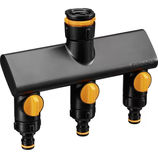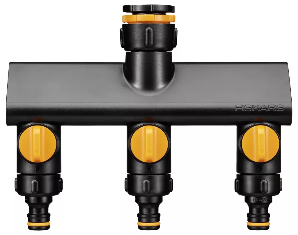Equipment: Fiskars Comfort 3-utas szelep, Be/Ki, a vízforrást három, független áramlásszelepekkel ellátott csatlakozásra osztja