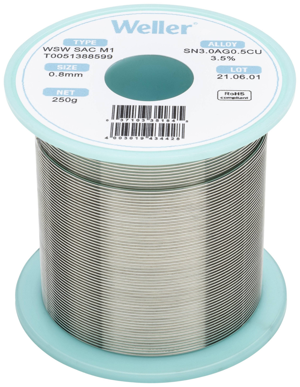 Forrasztóón, ólommentes, tekercs, Weller WSW SAC M1 Sn3.0Ag0.5Cu 250 g 0.8 mm