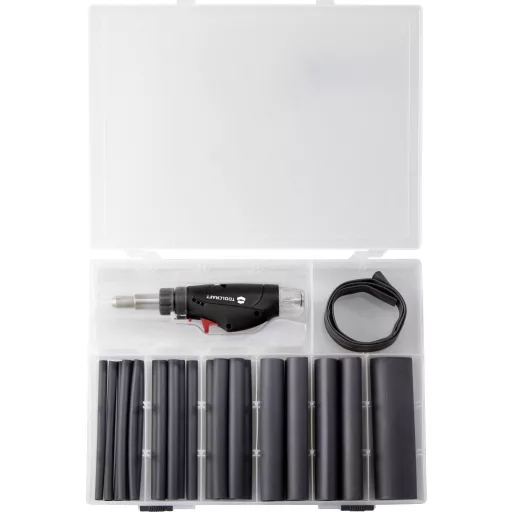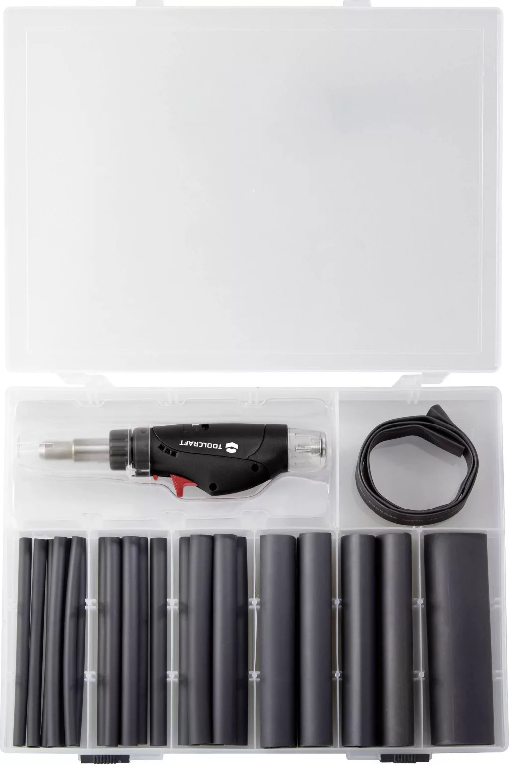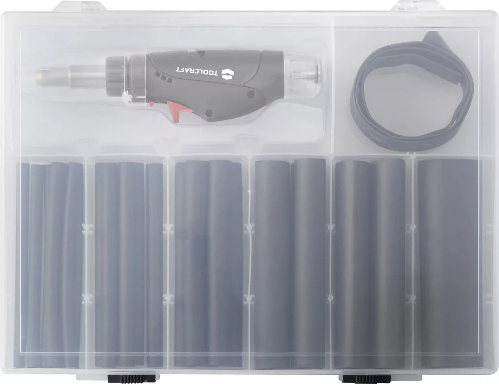 Ez a Toolcraft zsugorcső készlet egy beállítható láng vagy láng nélküli max. 1300 °C-os melegítési funkcióval rendelkező gázégőt tartalmaz . Beépített piezo gyújtással butángázhoz. Gáztöltet jelző betekintő ablakkal. A vele szállított poliolefin zsugorcsövek (PEX) ragasztó nélkül használhatók mindenhol, ahol mozgó és rugalmas védelemre van szükség. Ha a csövet pl. egy a készletben lévő gázpisztollyal felhevítik, összezsugorodik és az összes kábelt fixen összetartja. Zsugorcsőre a következő helyzetekben lehet szükség: dróttörés, elektromos szigetelés, mechanikus kábelvédelem, drót összekötés.