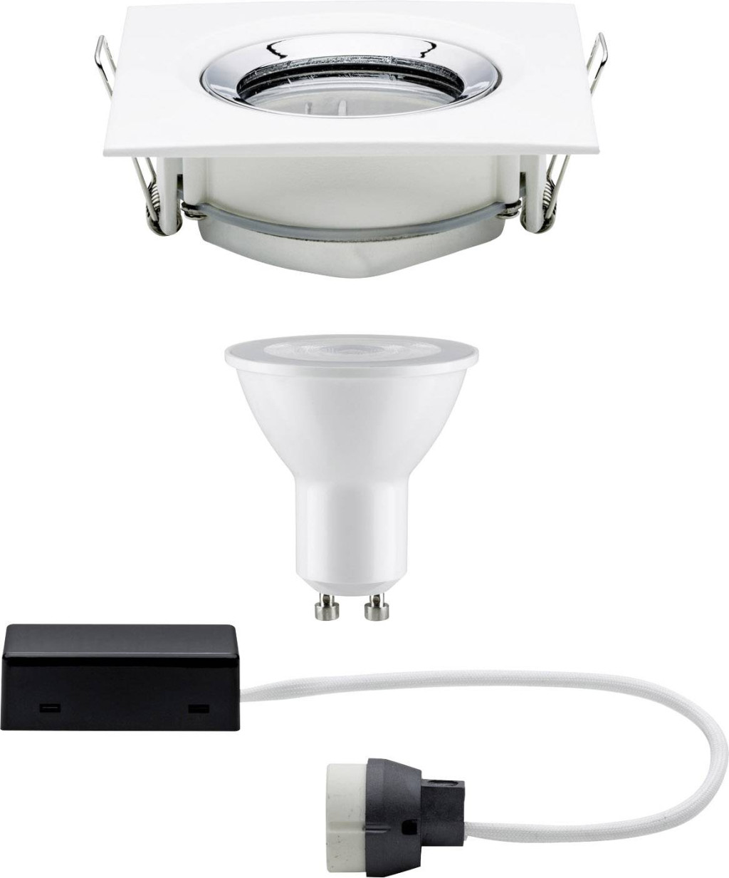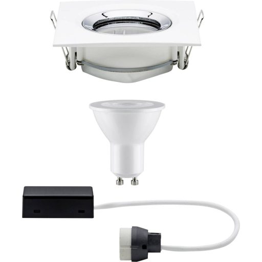 Műszaki adatok: Anyag: Alumínium,Cink · Beépítési mélység: 9 cm · Beépítési átmérő: 8.3 cm · Energiahatékonysági osztály (A++ - E): A+ · Foglalat: GU10 · Forgási tartomány, max.: 30 ° · Fényforrás típus: LED · Fényforrások száma: 1 · Fényszín: Melegfehér · Fényáram összesen: 460 lm · Fényáram/fényforrás (lumen): 460 lm · Kivitel: Szögletes · Külső hossz: 9.3 cm · Külső szélesség: 9.3 cm · Lámpa jellemzők: Dönthető · Lámpa típus: Fürdőszobai beépíthető lámpa · Sugárzási szög: 36 ° · Szín: Fehér (matt),Króm · Súly: 523 g · Teljesítmény: 7 W · Teljesítmény fényforrásonként: 7 W · Védelmi osztály: II · Védelmi típus: IP65 · Üzemi feszültség: 230 V