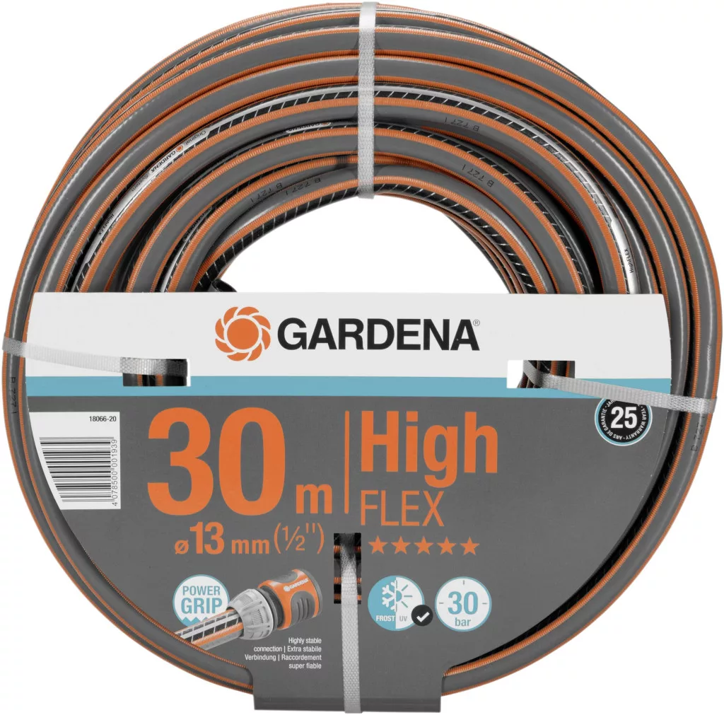 A GARDENA Comfort HighFLEX 13 mm-es (1/2" ) tömlője 30 m hosszú és 13 mm átmérőjű. A Power Grip profil stabil csatlakozást és optimális tartást biztosít a tömlő és a tömlődarab vagy a vízzáró között. A kerti tömlő nagyon méretstabil és rugalmas. A kiváló minőségű keresztbe szövésnek köszönhetően nem csomósodik és nem csavarodik. Fagy- és UV-állóságának köszönhetően a víztömlő egész évben kint maradhat. A nagy falvastagság hosszú élettartamot biztosít a tömlőnek, és akár 30 bar nyomásig is alkalmas. Káros anyagoktól mentes, ezért ftalátoktól (pl.
