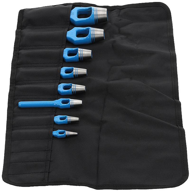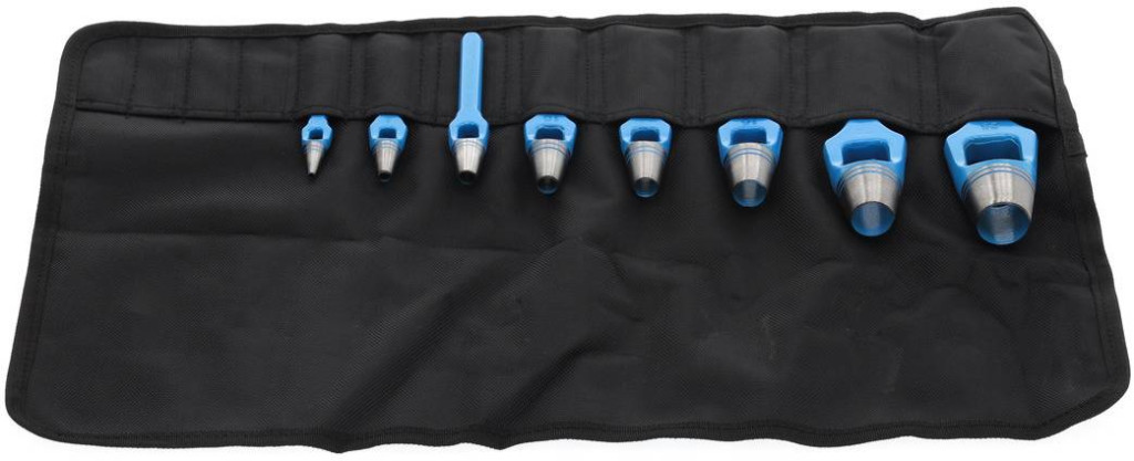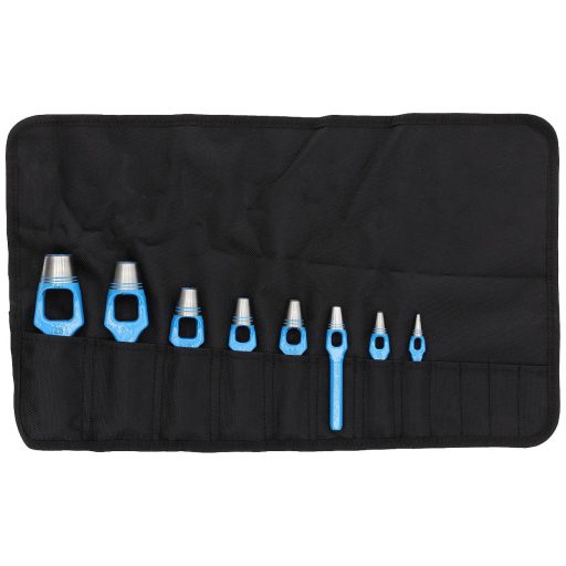 Jellemzők: A DIN 7200 A forma szerinti változat Karton, bőr, gumi, tömítőanyagok és más puha anyagok lyukasztására. Edzett vágóél, kék lakkolt tengely. Műanyag feltekercselő tokban.