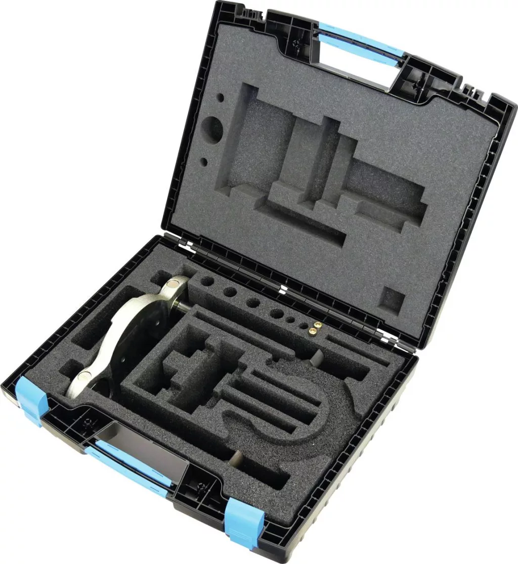 Ez az egyedülálló speciális eszköz lehetővé teszi a rugóstag teljes hosszának egyszerű csökkentését szorítással, ezáltal jelentősen gyorsabbá téve a McPherson rugóstagok ki- és beszerelését, különösen rugóstag-rögzítő furatokkal ellátott járműtengelyek esetén. Az olyan időigényes munkafolyamatok, mint a kardántengely, a féltengelycsukló, a vezető- és összekötőrúd-illesztések meglazítása, valamint a tengelybeállítás, teljesen kiküszöbölhetők. Előnyök: • Jelentős idő- és költségmegtakarítás, • Nem kell meglazítani a lengőkart, • Nem kell meglazítani a kardántengelyt, • Nem kell meglazítani a kormányösszekötő rúd fejét vagy a gömbcsuklót, • Nincs szükség kerékkiegyenesítésre, • Rugótípustól és rugóállandótól függetlenül használható, • Minden alkatrész pótalkatrészként kapható