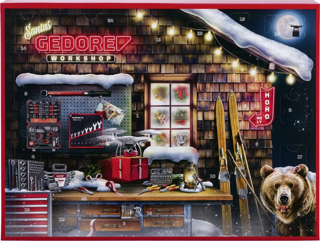 51 darabos adventi naptár. Tartalmaz egy mágneses bites csavarhúzót és egy szögletes csavarhúzó készletet, valamint 36 bitet PH, PZ, SL, IN, TX profilokban, 25 mm, 50 mm és 90 mm hosszúságban. Ezeket egy praktikus 1/4" -os gyorscserélő adapter és 8-as, 10-es és 13-as méretű dugókulcs-betétek egészítik ki. Praktikus tárolás egy praktikus műanyag tokban, GEDORE piros dizájnban.