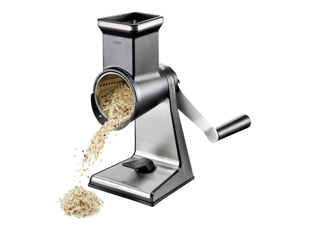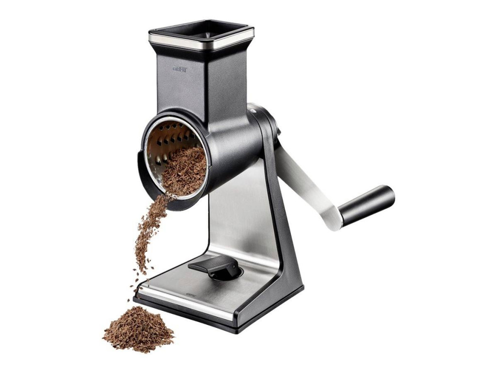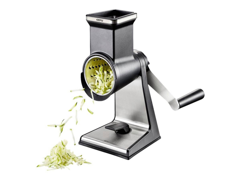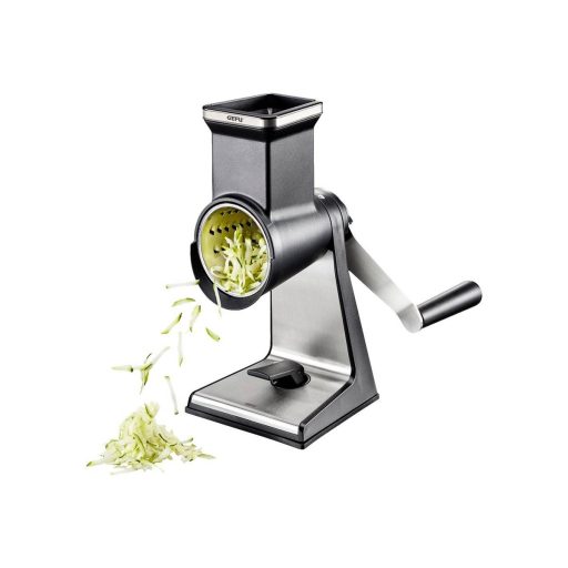 A három extra éles lézerrel vágott dobbal ellátott, többfunkciós dobreszelő a zöldségeket, gyümölcsöket, gesztenyét, sajtot, csokoládét és dióféléket finom pelyhekké vagy durva reszelőké alakítja. De könnyen és biztonságosan elkészíthető vékony szelet uborka vagy burgonya is. A reszelt vagy vágott anyag könnyen kicsúszik a kúpos dobokból. Praktikus mozsártörő gondoskodik a biztonságos utánpótlásról. Az extra magas talpnak köszönhetően magasabb tálak is elhelyezhetők a dobreszelő alatt. A szívóalap szilárd állványt tesz lehetővé, és akár 8 cm vastag munkalapokhoz vagy asztallapokhoz is rögzíthető asztali bilincs segítségével.