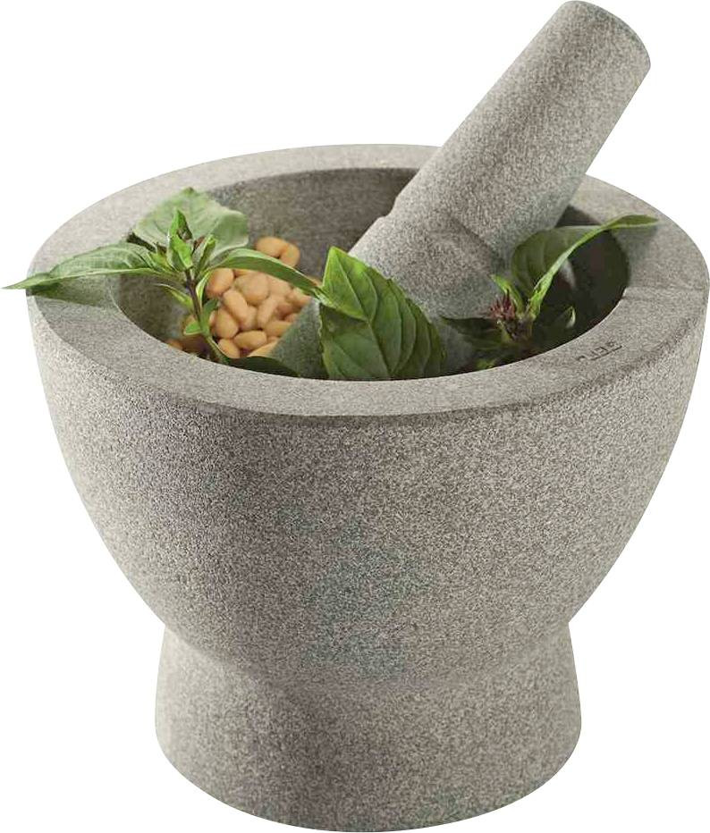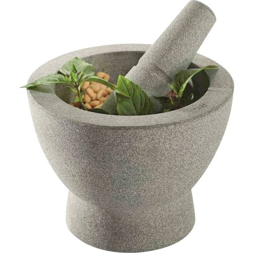 A nagy gránithabarcs fűszeres, kétszeres előnnyel jár a konyhában, mert mindkét oldalon használható - kis mennyiségű fűszerhez, vagy nagyobb mennyiségű pesto- és gyógynövénypasztához.