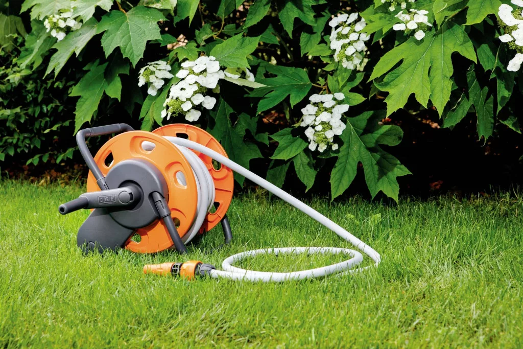 Hordozható tömlődob akár 20 m Ø 12,5 (½" ) tömlőhöz, beleértve a 15 m Ø 12,5 (½" ) tömlőt, 2 x tömlőcsatlakozást Ø 12,5 (½" ) és 15 mm (5/8" ) és fokozatmentesen állítható tömlőt permetező.