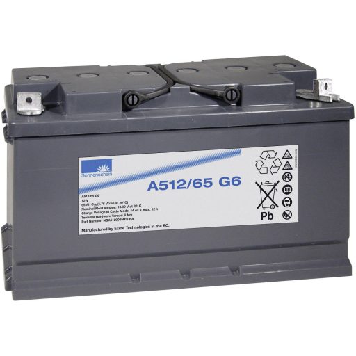 Műszaki adatok: Csatlakozó (akku): M6 csavaros csatlakozó · Elem jellemzők: Karbantartásmentes · Elem-/akkutechnológia: Ólom-zselés · Felhasználási területek: Riasztóberendezések, Elektromos járművek · Feszültség: 12 V · Kapacitás (mAh, Ah): 65 Ah · Méret, magasság: 190 mm · Méret, mélység: 175 mm · Méret, szélesség: 353 mm · Pólustípus: G-M6 · Súly: 24 kg · További műszaki adatok: Belső ellenállás 8,5 mΩ · Rövidzárlati áram 1471 A · VDS engedély: Nem · Újratölthető: Igen