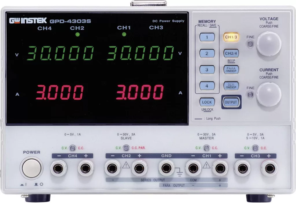 Műszaki adatok: Csatlakozók: USB · Gyártói szám: GPD-4303S · Kalibrált: ISO · Kimenetek száma: 4 x · Kimeneti feszültség (max.): 30 V/DC · Kimeneti feszültség (min.): 0 V/DC · Kimeneti feszültség 2 (max.): 30 V/DC · Kimeneti feszültség 2 (min.): 0 V/DC · Kimeneti feszültség 3 (max.): 10 V/DC · Kimeneti feszültség 3 (min.): 0 V/DC · Kimeneti feszültség 4 (max.): 5 V/DC · Kimeneti feszültség 4 (min.): 5 V/DC · Kimeneti áram (max.): 3 A · Kimeneti áram 2 (max.): 3 A · Kimeneti áram 2 (min.): 0 A · Kimeneti áram 3 (max.): 3 A · Kimeneti áram 3 (min.): 0 A · Kimeneti áram 4 (max.): 1 A · Kimeneti áram 4 (min.): 1 A · Labortápegység jellemzők: Távirányítható · Labortápegység típus: Labortápegység, szabályozható · Min. kimeneti áram: 0 A · Méret, magasság: 130 mm · Méret, szélesség: 210 mm · Súly: 7 kg · Technológia (tápegység): Lineárisan szabályozott · Teljesítmény: 195 W · Terhelésleszabályozás:
