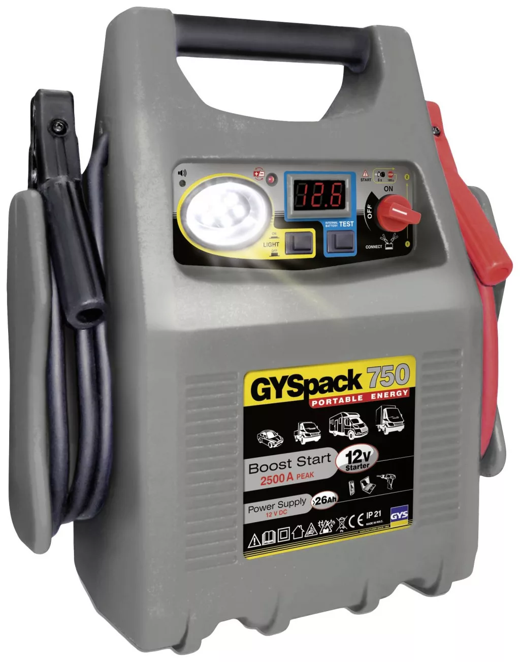 Szállítás tartalma: Gyspack 750 12V, Töltő tápegység, 12 V-os szivargyújtó csatlakozó, Használati útmutató