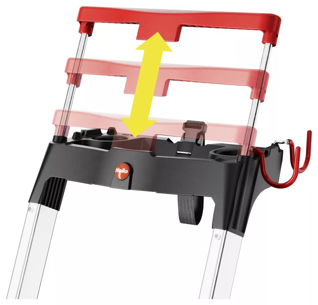 Az alumínium biztonsági lépcső többfunkciós héjjal, biztonsági tartóval és peron zárral biztosítja a biztonságot XXL formátumban: 130 mm-es extra mély lépésekkel.