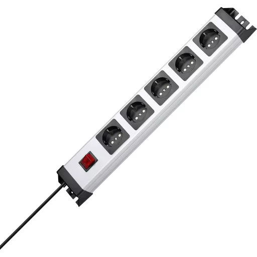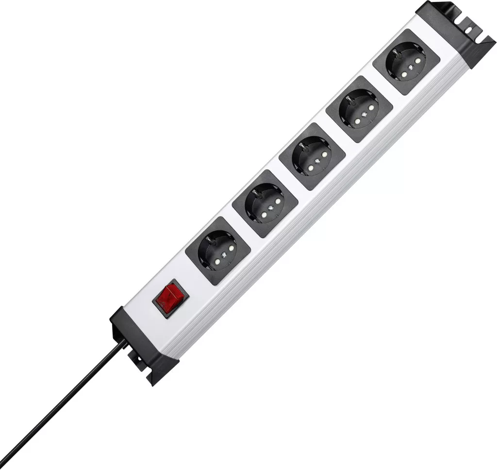 Műszaki adatok: Alkalmazási terület: Beltér · Anyag: Műanyag · Csatlakozási teljesítmény: 3600 W · Dugaljak száma: 5 · Gyermekvédelem: Igen · Hálózati elosztó jellemzők: Gyermekvédelem,Kapcsolóval · Kivitel: Szerelési lyukak · Kábel típus DIN/VDE szerint: H05VV-F 3G 1,5 mm² · Kábelhossz: 1.40 m · Méret, hossz: 482.6 mm · Méret, magasság: 58 mm · Méret, szélesség: 71 mm · Szín: Szürke,Fekete · Típus: Elosztók kapcsolóval · Védelmi típus: IP20 · Üzemi feszültség: 230 V