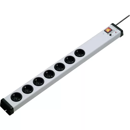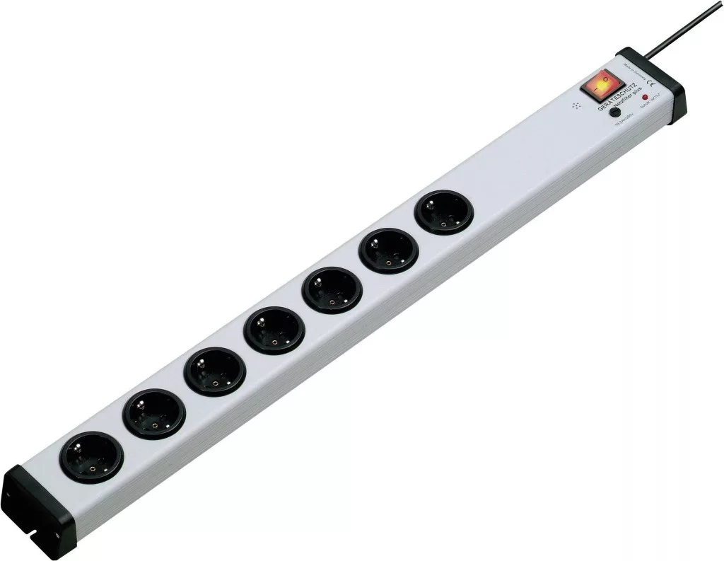 Műszaki adatok: Alkalmazási terület: Beltér · Anyag: Műanyag · Csatlakozási teljesítmény: 3600 W · Dugaljak száma: 7 · Gyermekvédelem: Igen · Hálózati elosztó jellemzők: Túlfeszültség elleni védelem,Kapcsolóval,Gyermekvédelem · Kivitel: Szerelési lyukak · Kábel típus DIN/VDE szerint: H05VV 3G 1,5 mm² · Kábelhossz: 1.50 m · Levezető áram: 5 kA · Méret, hossz: 718 mm · Méret, magasság: 47 mm · Méret, szélesség: 74 mm · Működés jelző: Optikai · Szín: Szürke · Típus: Túlfeszültség ellen védő elosztó