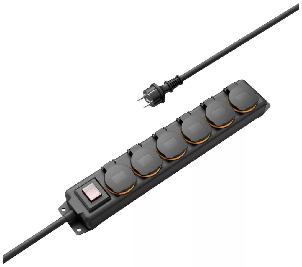 Műszaki adatok: 2021-es energiahatékonysági osztályok: n.rel. · Alkalmazás helye: Kültér · Anyag: Műanyag · Csatlakozási teljesítmény (max.): 3680 W · Dugaljak száma: 6 · Gyártói szín: Fekete · Hálózati csatlakozó típus: Védőérintkezős · Hálózati elosztó jellemzők: Gyermekvédelem, Kapcsolóval · Kábelhossz: 2 m · Méret, hossz: 431 mm · Méret, magasság: 47 mm · Méret, szélesség: 72 mm · További műszaki adatok: Kábel típusa: H05VV-F3G1.5