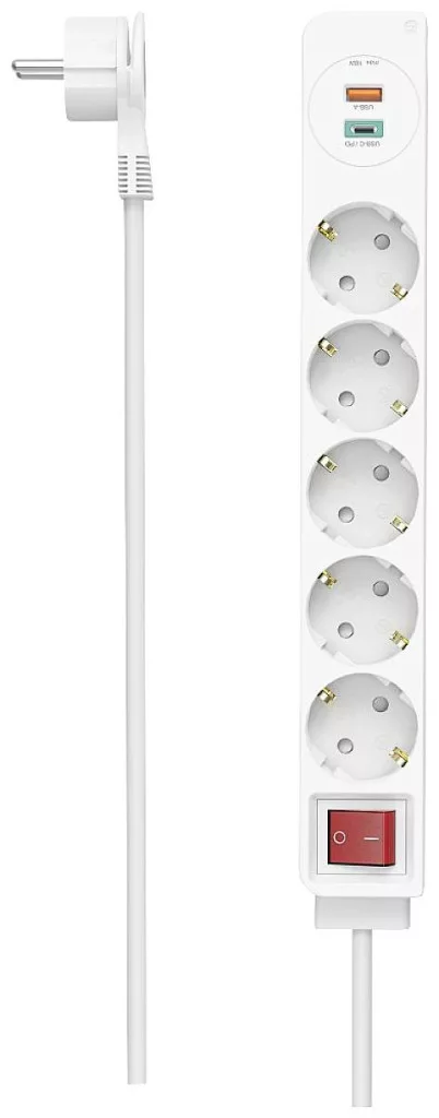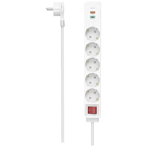 Elosztó, 5 utas, USB-C/A 18 W, PD/QC™, kapcsoló, lapos kar, 1,4 m, W