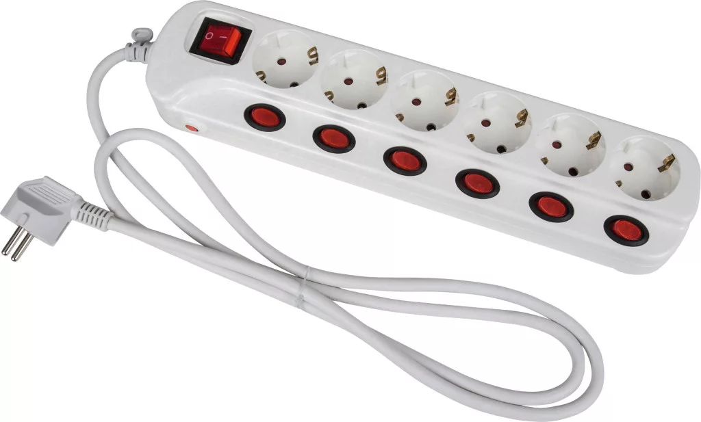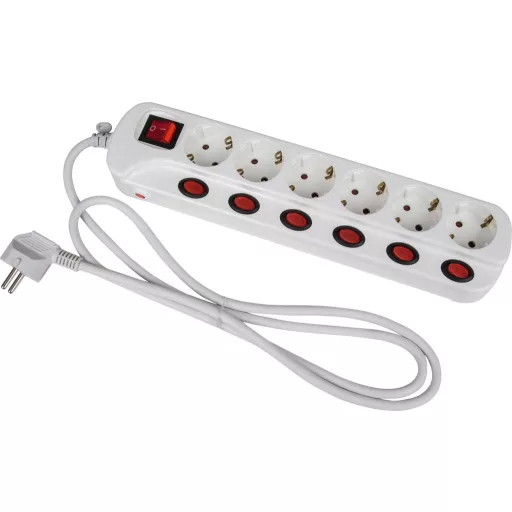 Aljzatcsík 6 földelt dugaszhoz. Minden dugaszalj külön kapcsolható. A kikapcsolás 2 pólusú. A túlterhelés elleni védelem visszaállítható.