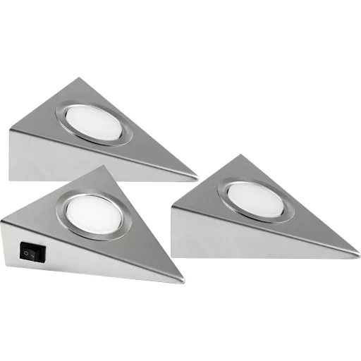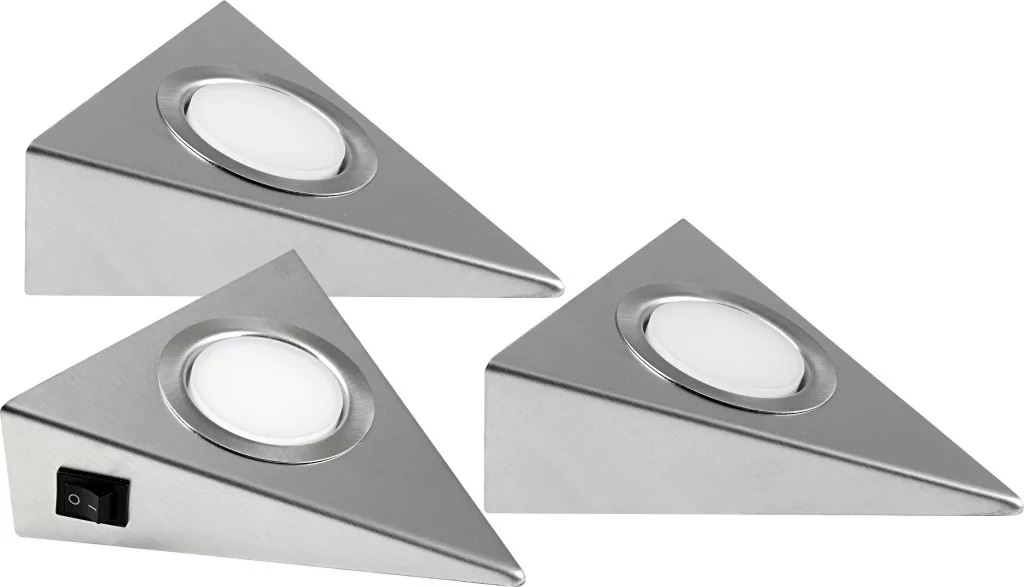 Technical specifications: 2021-es energiahatékonysági osztályok: n.rel. · Anyag: Acél · Foglalat: Fixen beépített LED-es · Fényforrás típus: LED (egyszínű) · Fényforrással: Igen · Fényszín: 3000 K · Fényszín (fényforrás): Melegfehér · Fényáram összesen: 360 lm · Fényáram/fényforrás (lumen): 120 lm · Kivitel: Háromszög · Méret, hossz: 137 mm · Méret, magasság: 45 mm · Méret, szélesség: 135 mm · Space (lights): Konyha · Sugárzási szög: 120 ° · Szín: Nemesacél · Súly: 0.641 kg · Teljesítmény: 6 W · Teljesítmény fényforrásonként: 2 W · Tápellátás: Hálózatról üzemeltetett · Védelmi osztály: II · Védelmi típus: IP20 · Üzemi feszültség: 12 V/DC