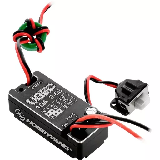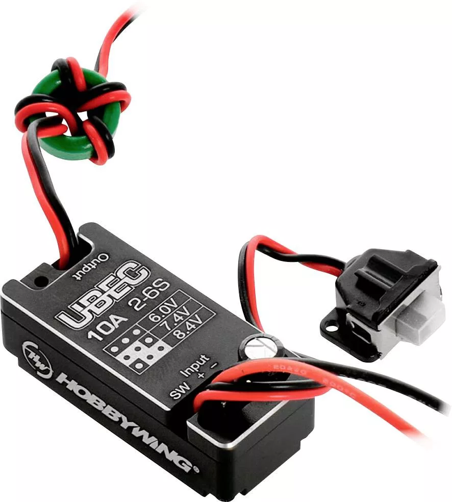 Az UBEC egy nagy teljesítményű DC-DC kapcsolómodult használ, amely 2-6S LiPos-ból veszi a feszültséget. A modul a feszültséget egy előre meghatározott értékre szabályozza le, amelyet a vevő vagy más elektronikus eszközök igényelnek. Rendkívül stabil, és a kimeneti áram akár 10A tartósan vagy 15A rövid ideig.
