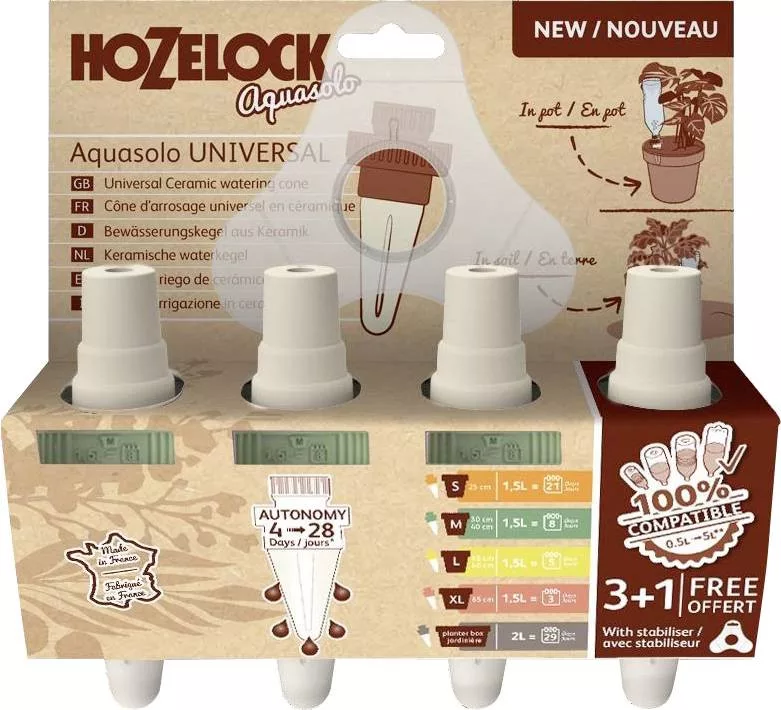 Az új Aquasolo kerámia öntözőkúp innovatív módot kínál az értékes növények öntözésére otthon és kertben, amíg Ön távol van. Ez az egyszerű önöntöző rendszer egy kerámia kúpból és egy műanyag csavaros adapterből áll. Néhány perc alatt könnyedén összeszerelhető. Az Aquasolo újratölthető víztartályként is használható a „szomjas” növények folyékony műtrágyával vagy hasonlóval való ellátására, valamint üvegházi és szobanövények számára egyaránt alkalmas. A 3 méretben kapható, kicsi, közepes és nagy, az öntözőkúpok kompatibilisek a legtöbb 0,5-2 l űrtartalmú palacktípussal. Az Aquasolo optimális teljesítménye és hosszú élettartama érdekében néhány havonta távolítsa el a kúpot, merítse ecetes oldatba, kefélje le, majd öblítse le tiszta vízzel. Az Aquasolo® Watering Cone Set Medium 30-40 cm-es cserepekhez alkalmas, és a palack méretétől függően akár 10 napig (20 cl naponta) látja el a növényeket, és csomagonként 4 kúpot tartalmaz.