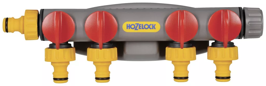 4-utas csapcsatlakozó négy tömlő egyéni vagy egyidejű használatához, valamint automatikus öntözőrendszerekhez és külső csaptelepről történő vezérléshez. Két darab Ø 12,5 mm-es tömlővel és falra rögzíthető rögzítőanyaggal szállítjuk (levehető). Adaptergyűrűjével ez az elosztó 3/4" , 1/2" , 1" külső menetes csapokhoz alkalmas. Minden kimenet szabályozószeleppel és gyorscsatlakozó tömlőcsatlakozók csatlakozására alkalmas. A Hozelock csatlakozók, permetezők és zuhanyzók kompatibilisek az összes többi jól ismert márkával.
