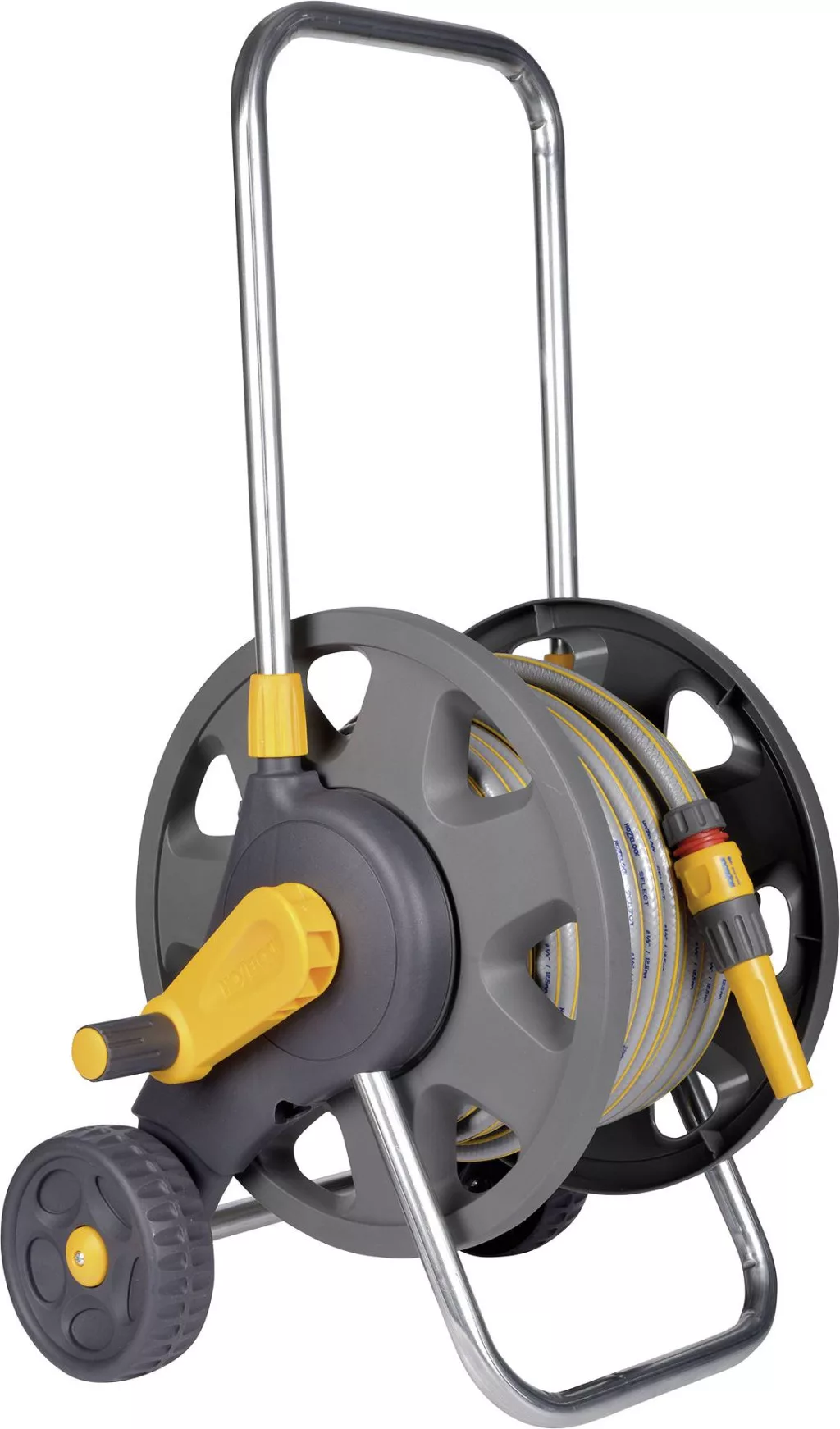 Stabil és könnyen szállítható tömlőkocsi nagy forgó fogantyúval. Ez a modell kis és közepes méretű kertekbe alkalmas, és akár 45 méter (Ø12,5 mm) tömlő befogadására is alkalmas. Ez a tömlőkocsi már teljesen összeszerelt állapotban van, és 20 méter 12,5 mm-es tömlővel, folyamatosan állítható tömlővéggel és minden szükséges tartozékkal (3/4 és 1/2 csapcsatlakozás, tömlődarabok és vízzáró tömlődarabok) van felszerelve. A tömlőkocsi azonnal használatra kész, összeszerelés vagy beállítás nélkül. Kihúzható fogantyú a könnyű mozgatás és használat utáni tárolás érdekében.