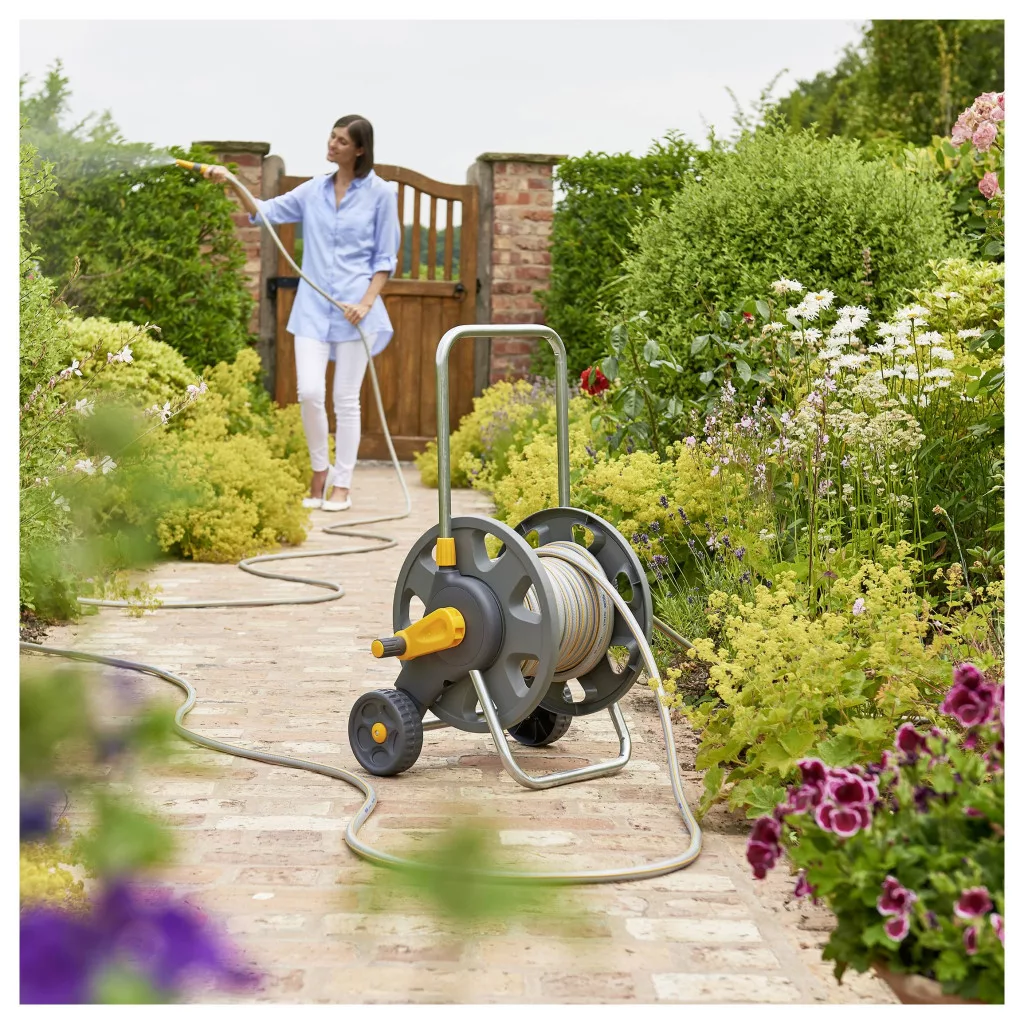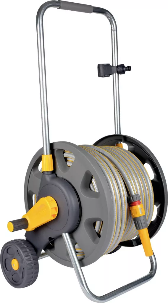 Stabil és könnyen szállítható tömlőkocsi, amely akár 90 méter Ø12,5 mm (1/2" ), 70 méter Ø15 mm (5/8" ) vagy 45 méter Ø19 mm (3/4" ) tömlő tárolására is alkalmas. A tömlőkocsi teljesen összeszerelt állapotban van, 50 méter 12,5 mm-es tömlővel, fokozatmentesen állítható tömlővéggel és minden szükséges tartozékkal (3/4 és 1/2 csapcsatlakozás, tömlődarabok és vízzáró tömlődarabok) felszerelve, és azonnal használatra kész.