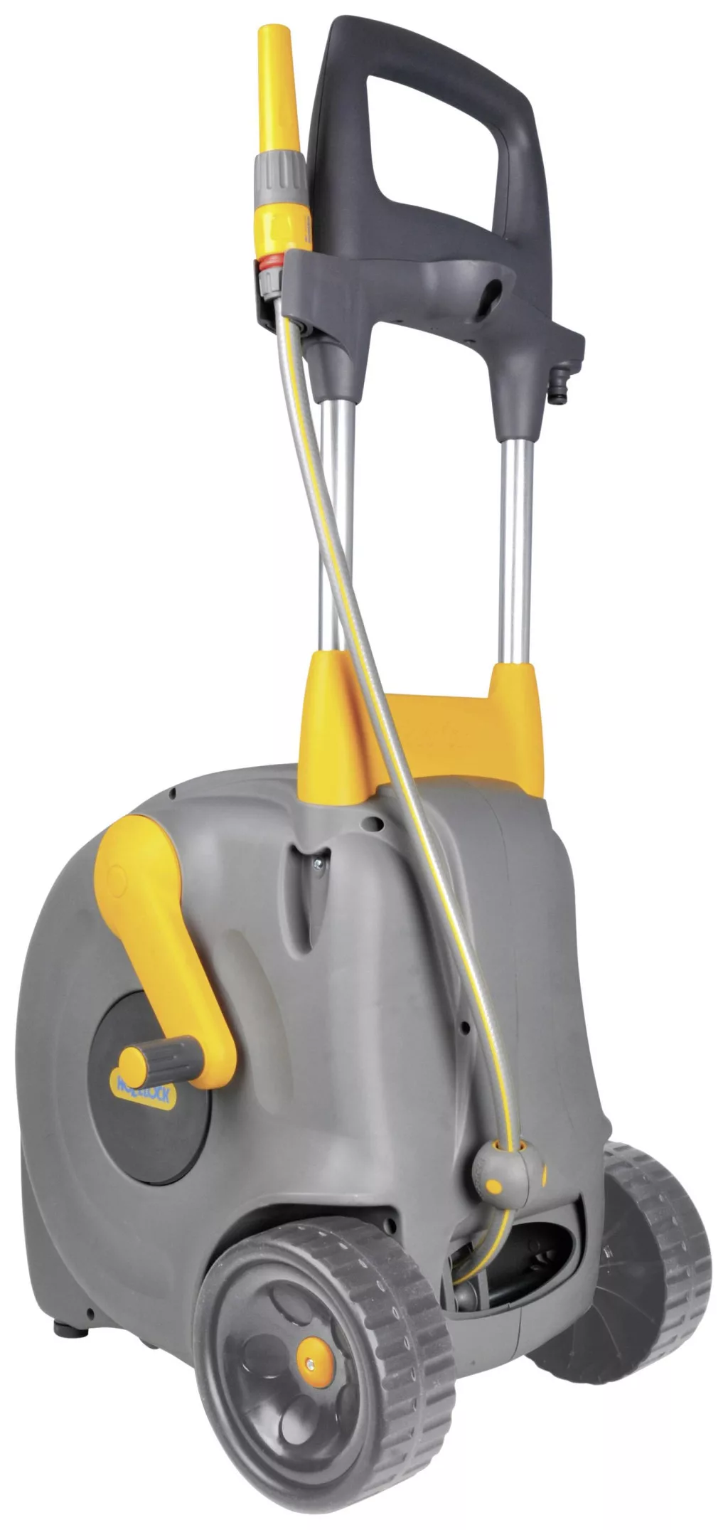 Tömlő kocsi zárt tömlődobozzal és 40 m-es tömlővel. Minden csatlakozással (3/4 és 1/2 csapos csatlakozás, tömlődarabok és tömlődarabok vízleállítóval) és folyamatosan állítható tömlőfecskendővel. Nagyon egyszerű, tiszta és rendben a tömlő feltekerése az innovatív "Easy Rewind" feltekercs rendszerrel, automatikus tömlővezetéssel. A tömlő mindig rendesen fel van tekerve a rétegeiben. Az állítható magasságú fogantyú és a tartozékok tárolóeszköze a Fast Cart-et tökéletes kerti segítővé teszi.