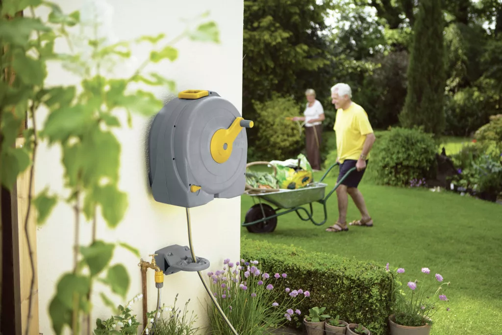 Fali tömlődoboz 40 méteres (Ø 12,5 mm) tömlővel. A tömlő egyszerű, könnyed és rendezett felcsévélése az „Easy Rewind” feltekercselő rendszernek köszönhetően automatikus tömlővezetéssel. Ily módon kerti tömlőjét mindig tökéletesen és helytakarékosan tárolják. Alkalmas nagy és közepes méretű kertekbe. Teljesen felszerelt minden szükséges csatlakozással és egy fokozatmentesen állítható tömlőpermetezővel. Falra szereléshez szükséges szerelési anyagokkal együtt.