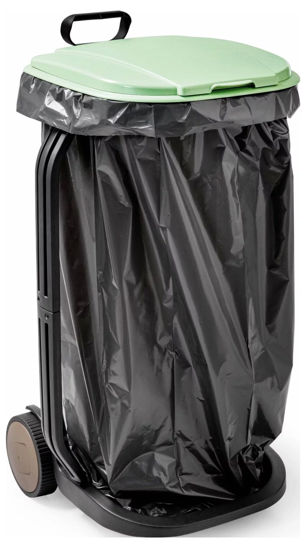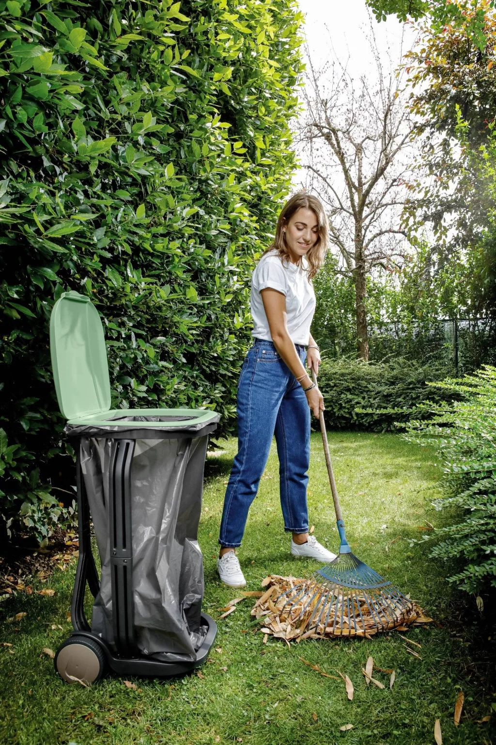 Ideális kerti hulladék, például levelek, levágott fű, stb. összegyűjtésére. Könnyű és praktikus, kerekekkel és fedéllel. Zsák űrtartalma: 100 l