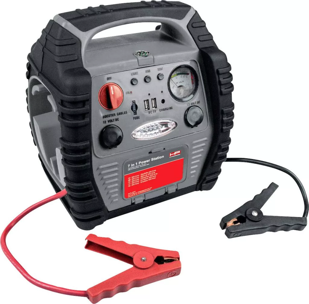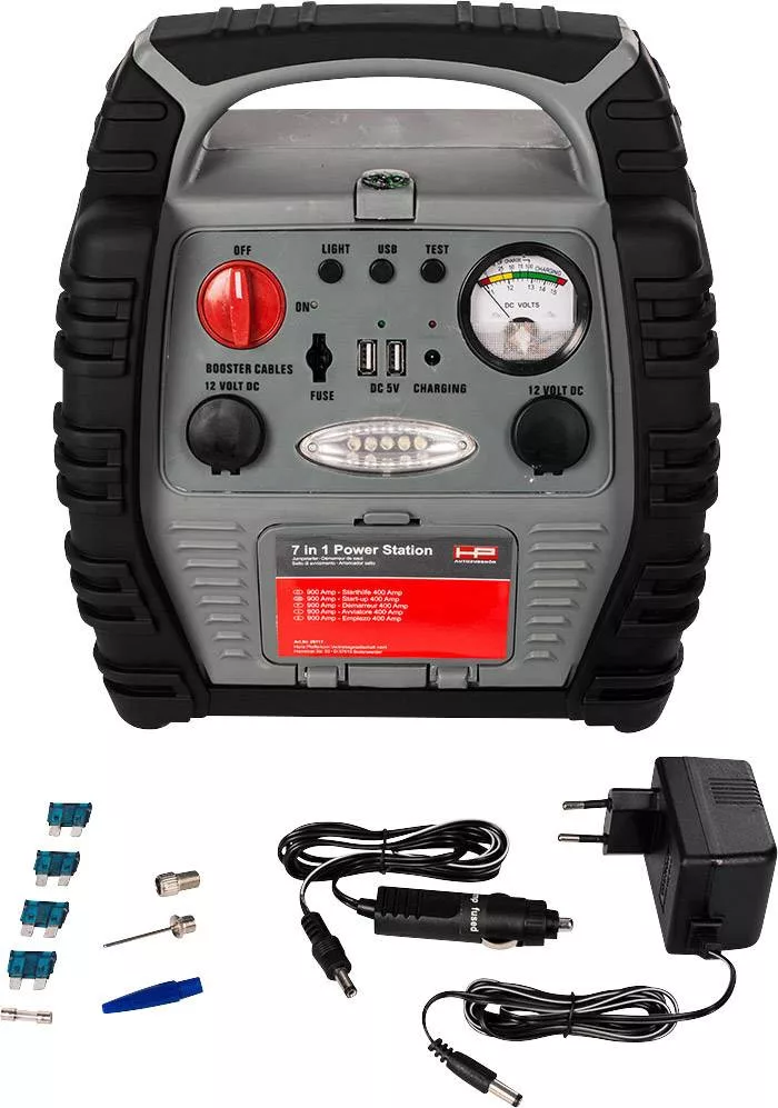 Jellemzők: Kompresszor · 2 további adapter szabadidős cikkekhez Feszültségátalakító 12 - 230 V 150 W · 5 LED-es munkalámpa · Védelmi áramkör és automatikus biztosíték · Be / ki kapcsoló, 2 db 12 V-os aljzat · 230 V-os aljzat · 2 USB aljzat · Iránytű · Töltésszint jelző · Ugróindító kábelek / bilincsek tartója · Töltse a mellékelt 230 V-os tápegységgel vagy 12 V-os szivargyújtó aljzaton keresztül.