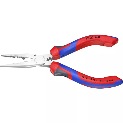 Műszaki adatok: Anyag: Króm-vanádium golyóscsapágy acél · Anyagjellemző: Edzett,Krómozott · Max. vágási érték, közepesen kemény drót: 2.5 mm · Méret, hossz: 160 mm · Súly: 139 g · További műszaki adatok: vágási értékek félkemény/kemény huzal Ø 2,5/1,6 mm · csupaszítási értékek 0,5 - 0,75/1,5/2,5 mm² · érvég-hüvely összesajtolási átmérő: 0,75/1,5/2,5 mm² · Típus: Huzalozó fogó · Vágási érték (max.) kemény drót: 1.6 mm · Vágóerő: 60 HRC