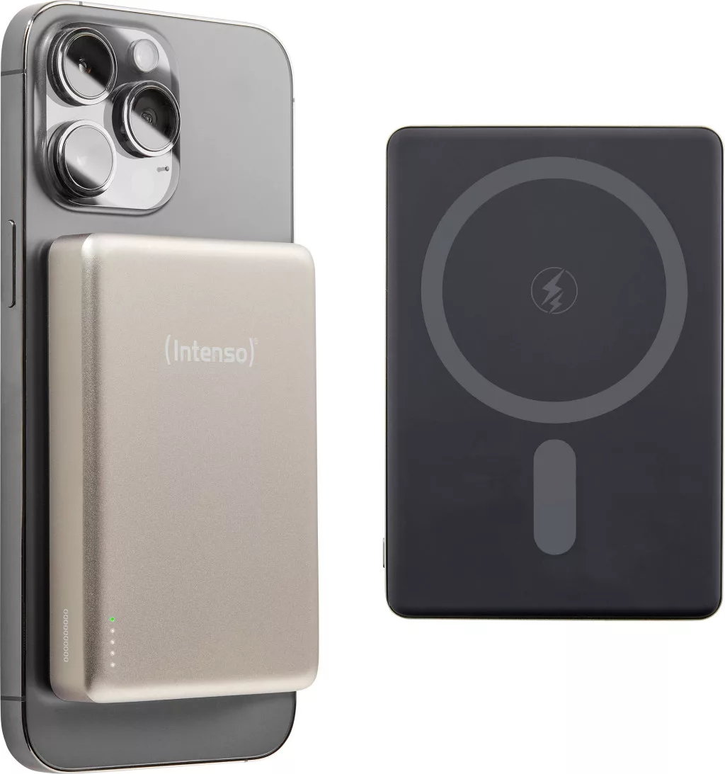 Intenso MW10000 mágneses külső akkumulátor 10000 mAh – MagSafe kompatibilis, vezeték nélküli töltés 15W, USB-C PD 20W, iPhone és Android készülékekhez – Németországban tesztelt – pezsgőszínű