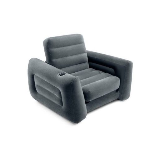 Az Intex 117 x 224 x 66 cm-es kihúzható széke sokoldalú, és bárhol kellemes kikapcsolódást garantál. A bolyhos, bársonyos felület gondoskodik a kényelemről. Nézzen tévét, olvasson könyvet, vagy egyszerűen csak lazítson a szürke székben a beépített italtartóval. Aludni egyszerűen húzza ki a párnát, és máris belemerülhet az álomvilágba a kényelmes matracon. A nagyméretű 2 az 1-ben szelep rendkívül széles nyílással biztosítja a gyors felfújást és leeresztést. Felfújáshoz kettős működésű vagy elektromos légszivattyú javasolt. Leeresztés után a fotel kompaktan összecsukható, ami kiváló tároláshoz vagy utazáshoz. Beltérre ideális.