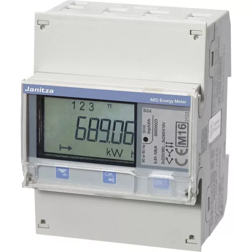 Jellemzők: MID energiamérő B24 312-10J (Modbus) felső kalapú sínkészülék, háromfázisú, valós B munka (1. osztály) reaktív 2. munkaosztály-átalakító csatlakoztatása 1 / 5A Modbus / RS 485 interfész, a MID és IEC1 impulzus kimenet 1-es kimeneti kimenet bemenete esetén a mérő leolvasása nem állítható vissza feszültség / áram bemenetek: névleges feszültség: 3 x 230 / 400V AC maximális áram: 6A csatlakozási keresztmetszet: 0,5 -10 mm² kommunikáció: csatlakozási keresztmetszet: 0,5 - 1 mm² impulzusok: impulzusfrekvencia kijelző: 5000 imp / kWh impulzushossz: 40ms impulzushossz kimenetek: 10-990ms min. Impulzushossz-bemenetek: 30 ms Frekvencia: 50 vagy 60 Hz + -5% Üzemi hőmérséklet: -40 ° C - + 70 ° C Tárolási hőmérséklet: -40 ° C - + 85 ° C Védettség: IP20 Méretek: 70 x 97 x 65 mm (SzxHxD) 4 DIN modul