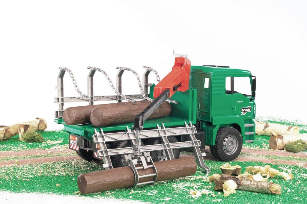 A man farönkszállító teherautó dönthető vezető kabinja által láthatóvá válik a motorblokk. A vezető kabin tükrei kihajtahtók, a farönkszállító teherautó oldalsó falai összecsukhatók. A teljesen működőképes rakodódaru egy markolóval rendelkezik, amivel a teherautó farönk szállítmánya meg- és lepakolható, három fatörzzsel szállítjuk. Profil abroncsok teszik teljessé a képet. A MAN farönkszállító teherautó játék világítással és hangmodullal egészíthető ki (rend. sz.: 02801, nem szállítjuk vele).