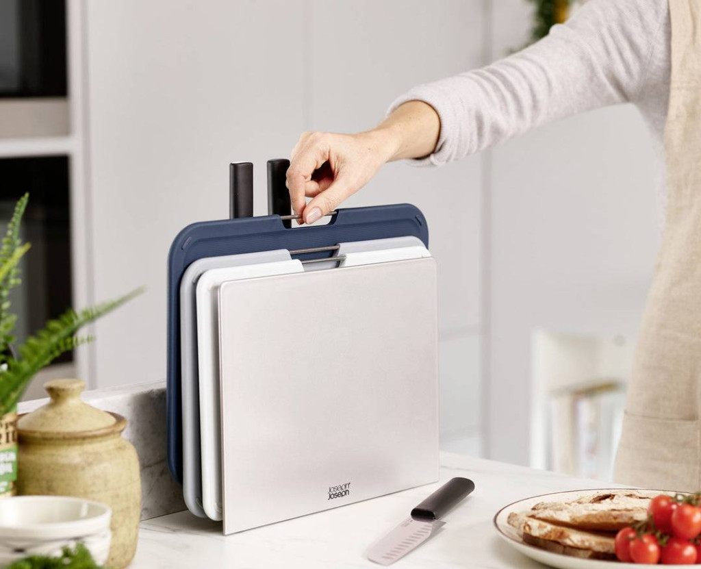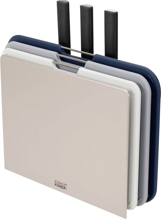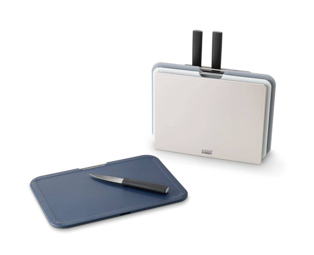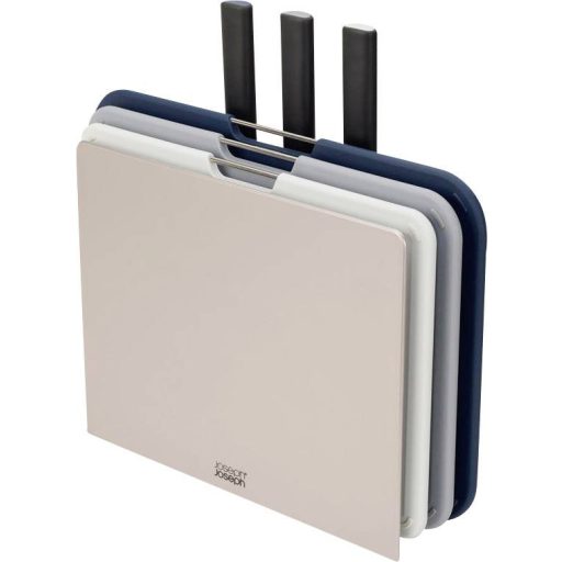 Joseph Joseph Nest konyhai négyszögletes vágódeszkák, rozsdamentes acél szürke, késekkel.