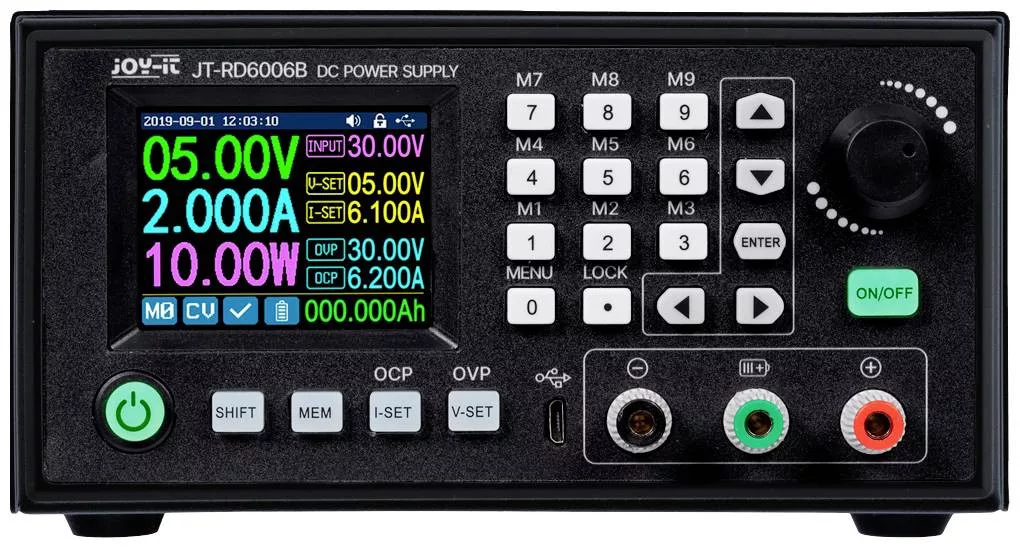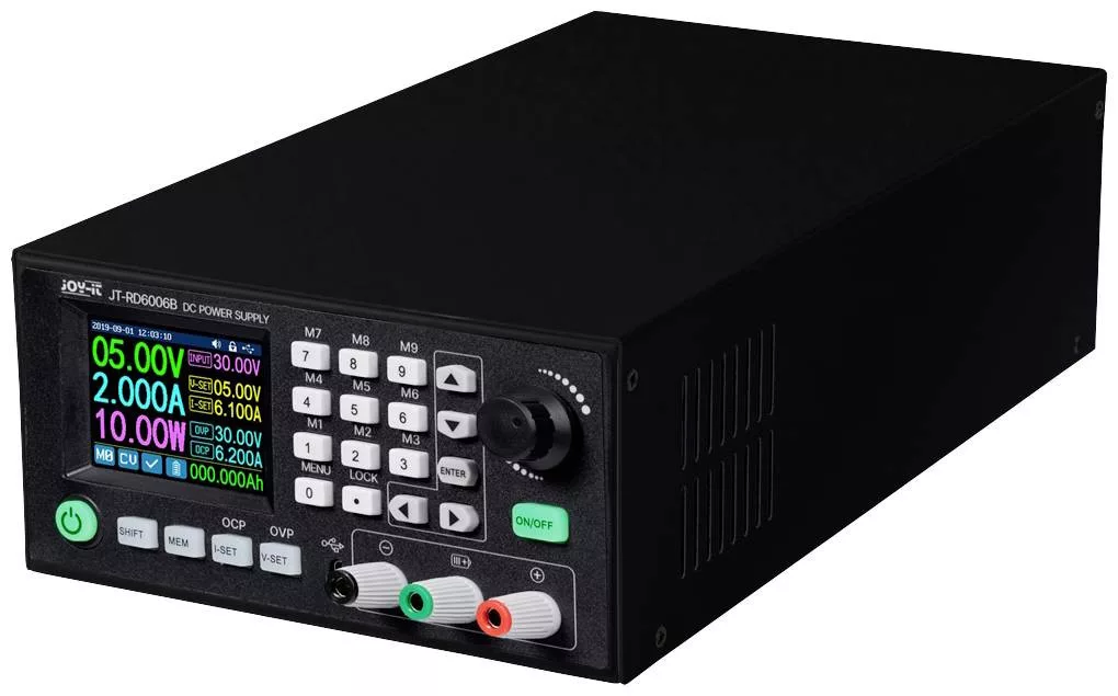 Az RD6006-CB " BLACK EDITION" készülékkel megbízható és nagy teljesítményű laboratóriumi tápegység áll az Ön rendelkezésére. A 0 - 60 V kimeneti feszültség tartomány és a 0 - 360 W közötti teljesítmény bármilyen típusú projektet megbirkózik. A kompakt kialakítás és a felhasználóbarát működés miatt az RD6006 kiváló választás minden alkalmazáshoz. A 9 memóriahely segítségével gyorsan és egyszerűen válthat a különböző beállítások között. Az USB interfésznek és a beépített WiFI modulnak köszönhetően az RD6006 szoftveresen üzemeltethető. A készülék különféle védelmi és korlátozó funkciókkal is rendelkezik, mint például állandó feszültségű működés, állandó áramú működés, túlfeszültségvédelem, túláramvédelem és cserélhető biztosítékok az áramköri lapon.