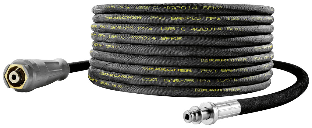 Nagynyomású tömlő (DN 6, 15 m hosszú, 250 bar nyomásig) AVS tömlőorsó csatlakozással és EASY!Lock kézi csavaros csatlakozással szerelve.