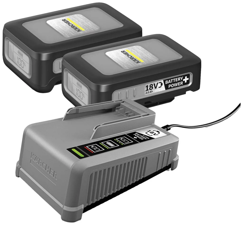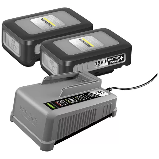 A Battery Power+ 18/30 indítókészlettel, amely 2 db nagy teljesítményű, 18 V/3,0 Ah-s akkumulátort tartalmaz innovatív valós idejű technológiával és egy pontosan illeszkedő gyorstöltővel, mindig készen áll a cselekvésre. A töltő gyorstöltési funkciójának köszönhetően zavartalan munkavégzés lehetséges. Az akkumulátorok minden 18 V-os Kärcher Battery Power és Kärcher Battery Power+ akkumulátorplatformhoz használhatók. A beépített LCD kijelző folyamatosan mutatja a hátralévő működési időt, a hátralévő töltési időt és a töltöttségi szintet