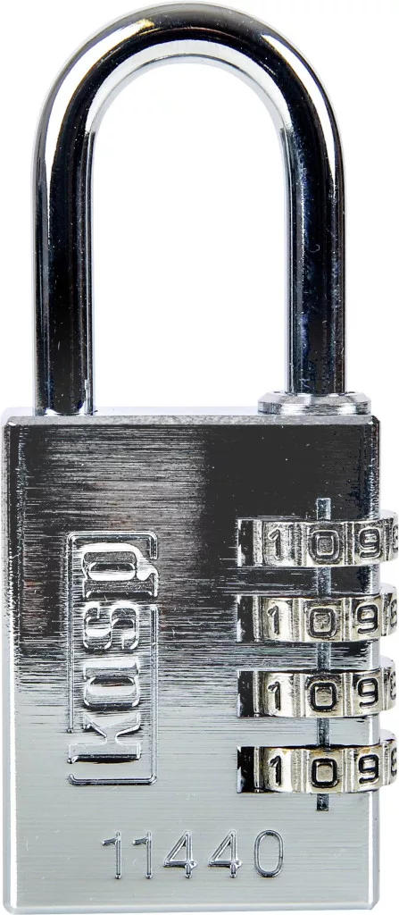 Krómozott sárgaréz zár, tükör polírozott. Rozsdamentes acél konzol. Rozsdamentes belső alkatrészek és vasalás elleni védelem. Egyedileg állítható kód, 4 jegyű.