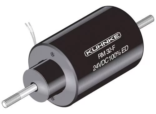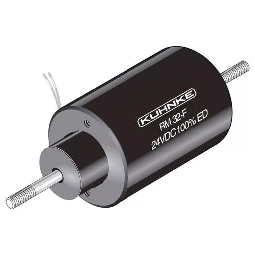 Nagy teljesítményű emelőmágnesek, Kuhnke RM 32 típus. Belső visszatérő rugóval, egyszeres működésű Kivitel: Kombinált mágnes (húzó- és lökésmágnes), karbantartást nem igénylő armatúra csapágy (DU csapágy) a legmagasabb követelményekhez. Névleges löket: 8,0 mm, névleges feszültség: 24 VDC, névleges teljesítmény: 6,5 W, kezdeti erő: 2,8 N, végső erő: 6,5 N, megengedett relatív munkaciklus (ED): 100%, csatlakozások: 100 mm hosszú szálak szabad végekkel , szigetelési osztály: B, határ hőmérséklet: +130 °C, próbafeszültség: 800 Veff., mágnes súlya: kb. 235 g, horgony tömege: kb. Típus: RM 32-RF-24VDC 100% ED, emelőmágnes