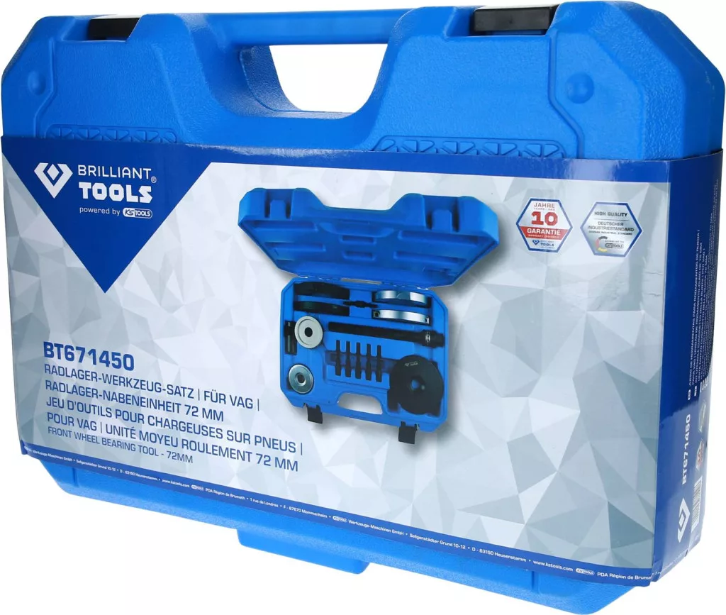 A BRILLIANT TOOLS kerékcsapágy-szerszámkészlet a BT671450 kerékcsapágy-agyegységhez ideális a kerékagy kerékcsapágyak sérülésmentes szét- és összeszereléséhez, 72 mm átmérőjű, felszerelt állapotban. A kormánycsukló egyébként szükséges eltávolítása és az ennek következtében szükséges kerékbeállítás már nem szükséges. Ezzel sok időt takaríthatunk meg. A legjobb minőségű kialakítású szerszám hosszú élettartammal rendelkezik a napi műhelyhasználat során. A csapágyak beépített szerelőkarimával rendelkeznek. Egy tartógyűrűvel is ellátták, amely a csapágyakat a házban tartja.