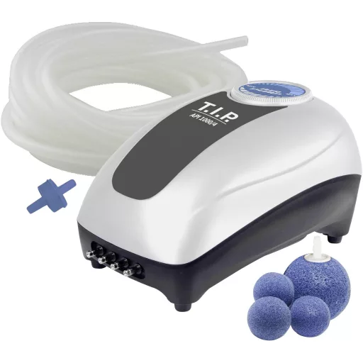 Szabályozható nagy teljesítményű tó levegőztető szivattyú beltéri hálózatra csatlakoztatáshoz, 4 levegőztető kimenettel. A halak életkörülményeit a tóban jelentősen javítja a hatékony oxigénellátás.