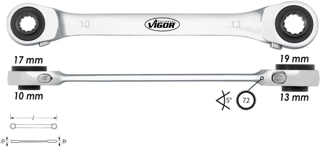 Műszaki adatok: Csavarkulcs típus: Kettős racsnis gyűrűskulcs · Fogak száma: 72 · Kulcsszélesség: 10 mm,13 mm,17 mm,19 mm · Méret, hossz: 220 mm