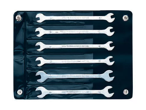 Elektronikai kettős villáskulcs készlet DIN 934. Nyersanyag: jó minőségű acél ötvözet. Villa állás 15°-ban, fej 10°-ban hajlik. Azonos méretű kulcsnyílás mindkét végén. Rendkívül hosszú és vékony kialakítás az elektronikai eszközök, irodai gépek és kommunikációs eszközök minden munkájához. Krómozott mikro-matt kivitel minőségi felülettel. Csomagolás: fekete műanyag tasakban. 4x4, 4.5x4.5, 5x5, 5.5x5.5, 6x6, 7x7.